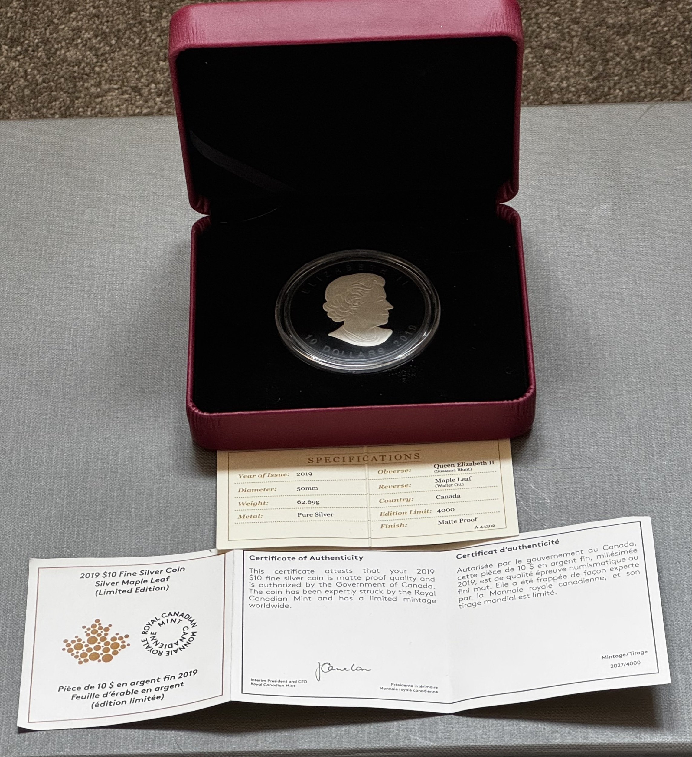 2019 2oz pure silver rhodium plated special edition maple leaf coin