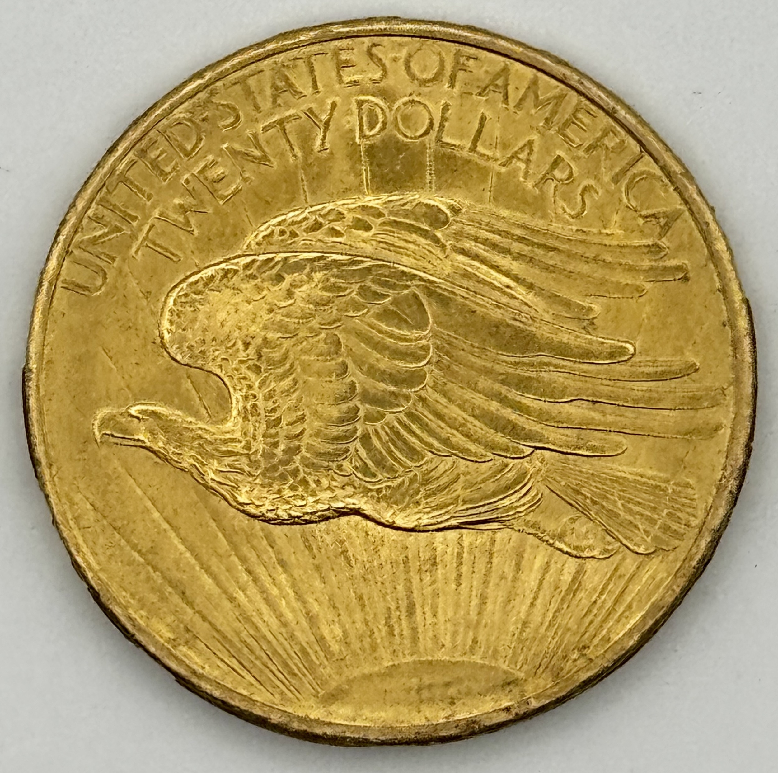Stunning 1908 $20 St-Gaudens gold double Eagle coin Struck at the Philadelphia mint and designed by Augustus Saint-Gaudens Gold Finess .900 (21.6 carat) A collectors favourite