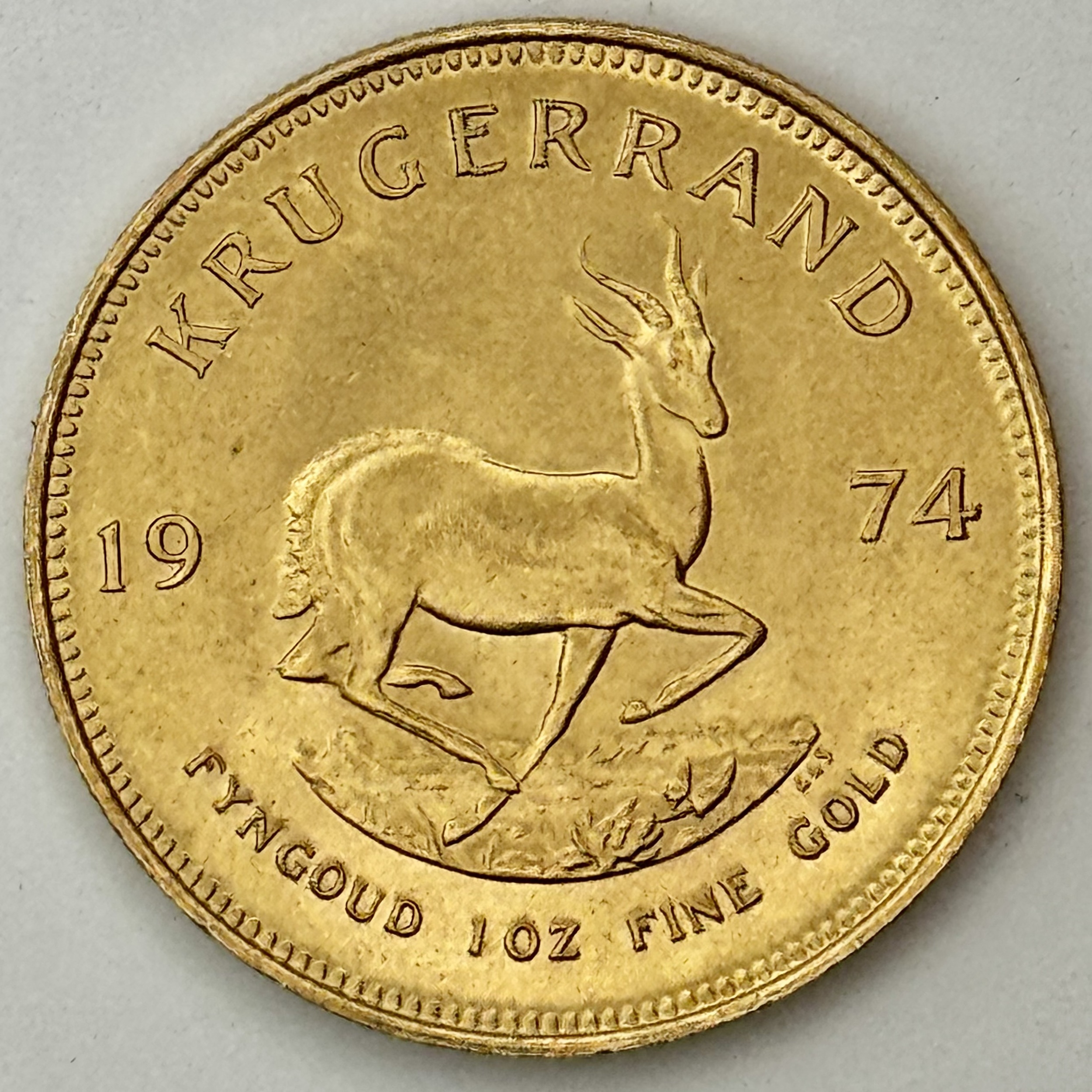 1974 gold 1 ounce Krugerrand The coins weighs 33.93g of 22 carat gold equating to exactly 1 Troy ounce of pure gold. Paul Kruger on the obverse and a Springbok on the reverse A collectors favourite and the most well known and recognised gold bullion investment coin in the world