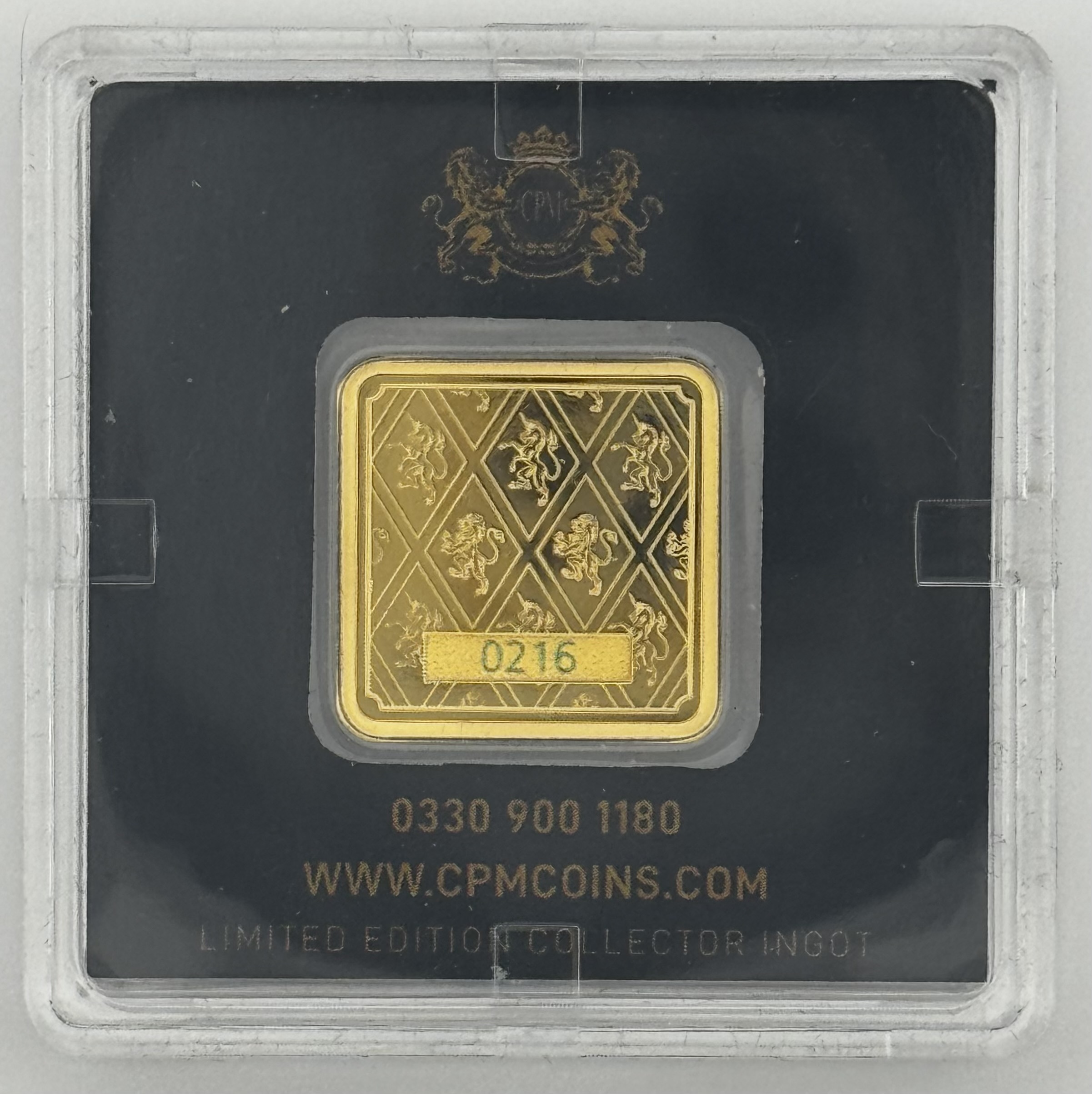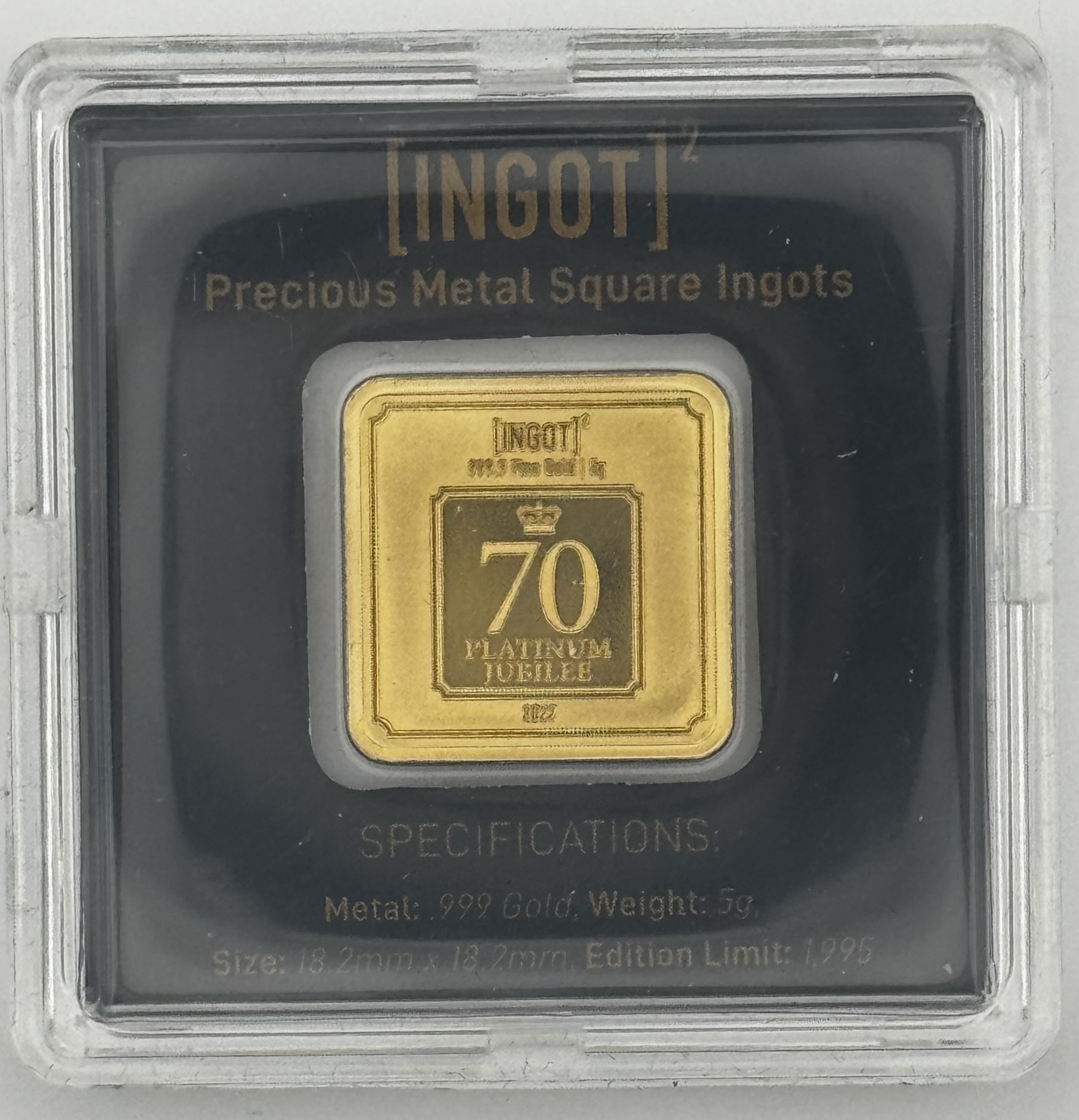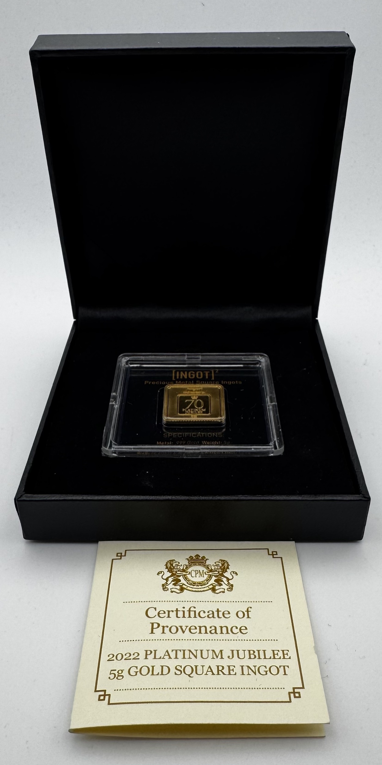 2022 Platinum jubilee 5g gold square ingot. Lion and unicorn pattern obverse with the Platinum Jubilee design reverse. Complete with all original packaging and COA.