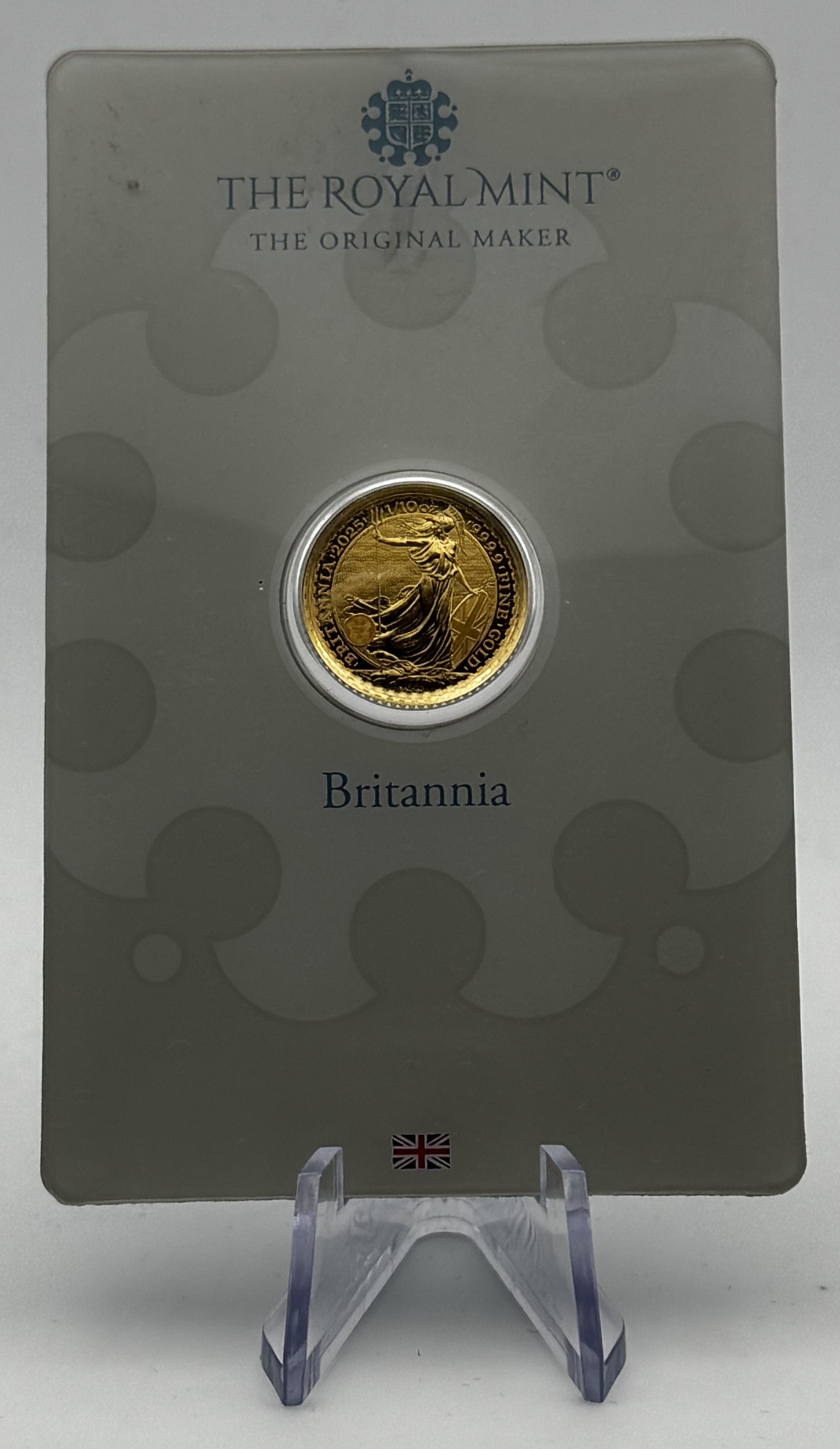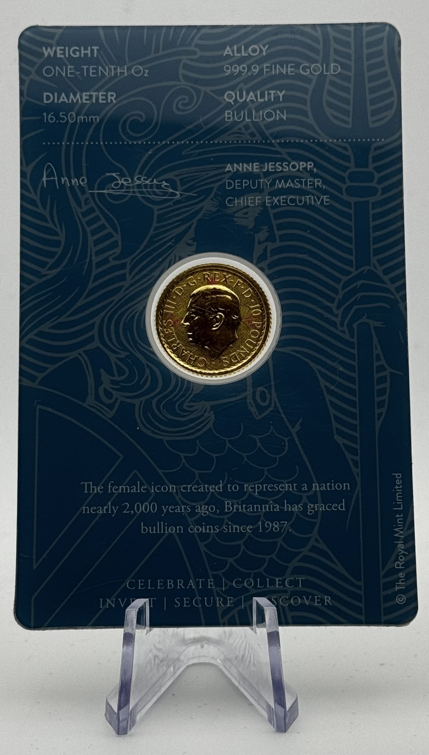 2025 King Charles III one tenth gold Britannia. As struck, immaculate condition. Comes in the original royal mint blister pack. We have 4 available.