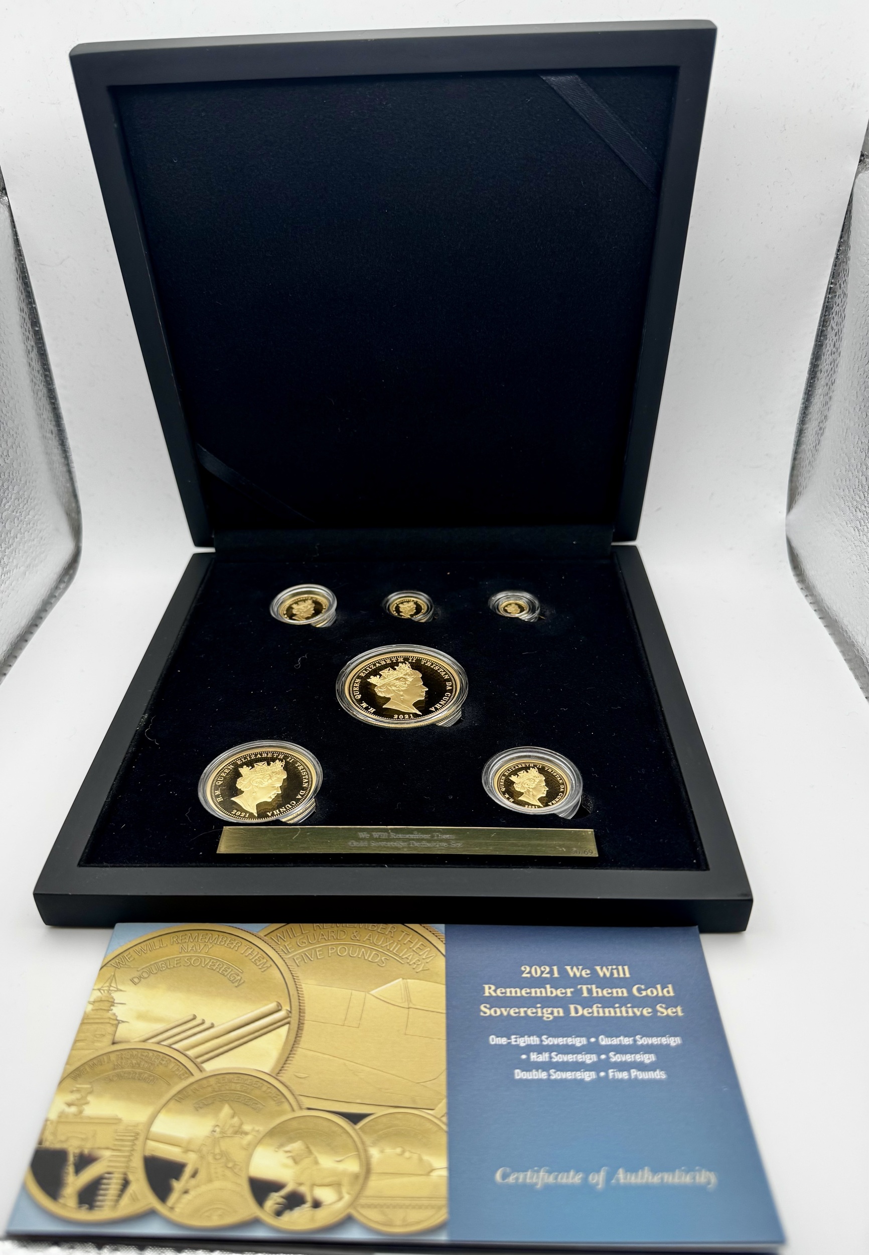 A very rare 22 carat gold (71 grams) Hattons of London gold definitive sovereign set of which there were only 69 minted, this being number 50. Set comprises the following £5 gold quintuple sovereign £2 gold double sovereign Gold sovereign Half sovereign Quarter sovereign 1/8 sovereign All coins are FDC - perfect proof