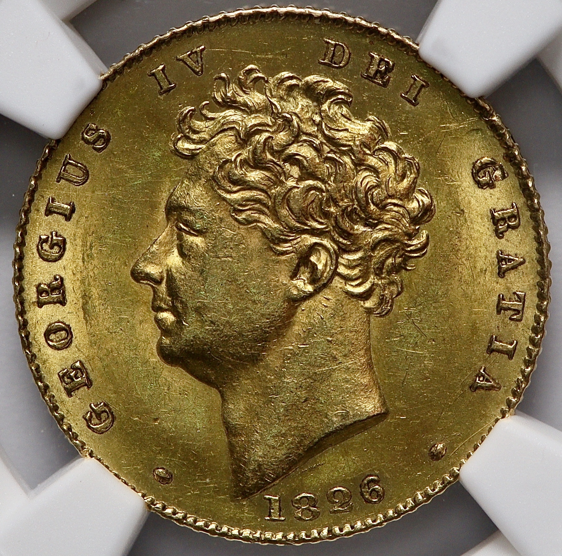 NGC MS62+. A choice example of a 1826 King George 1V gold half sovereign.