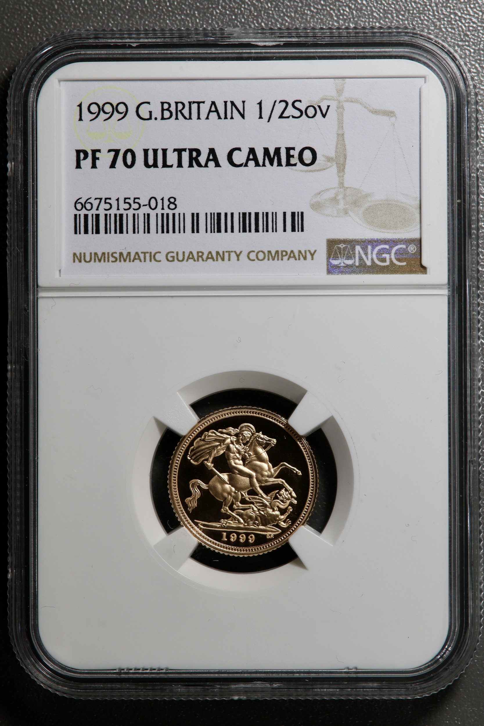 1999 Queen Elizabeth 11 gold half proof sovereign. Professionally graded by NGC PF70 - the finest
