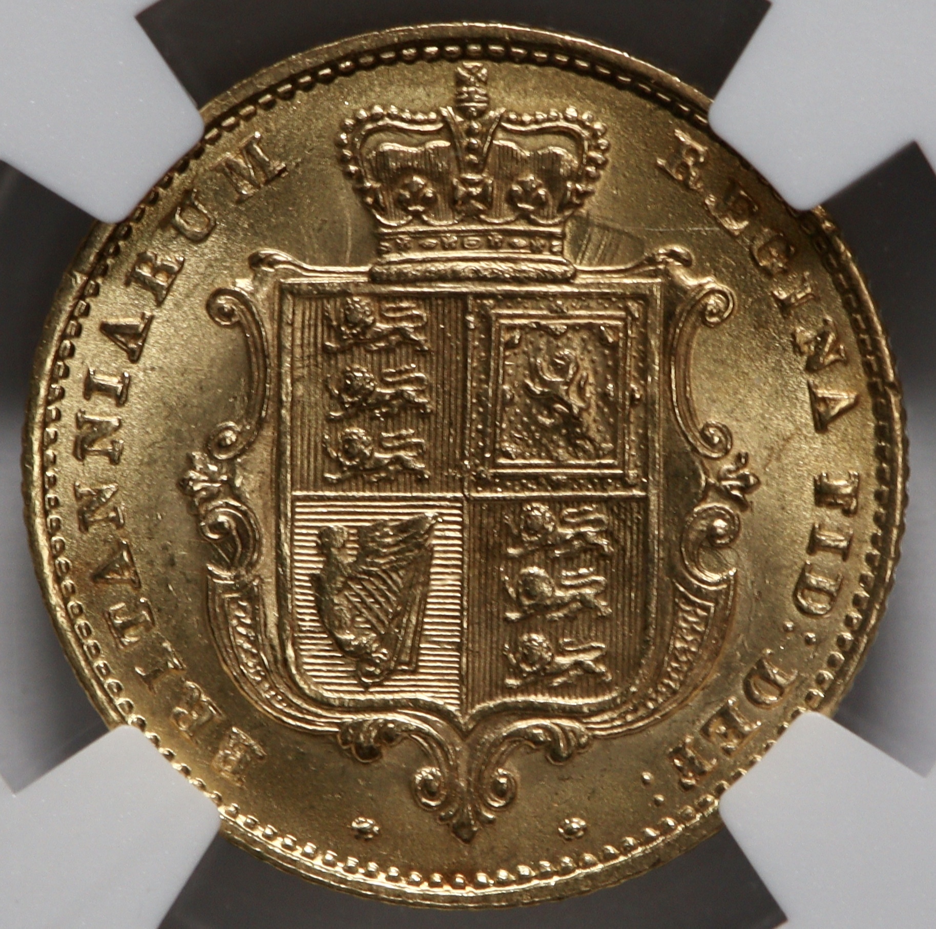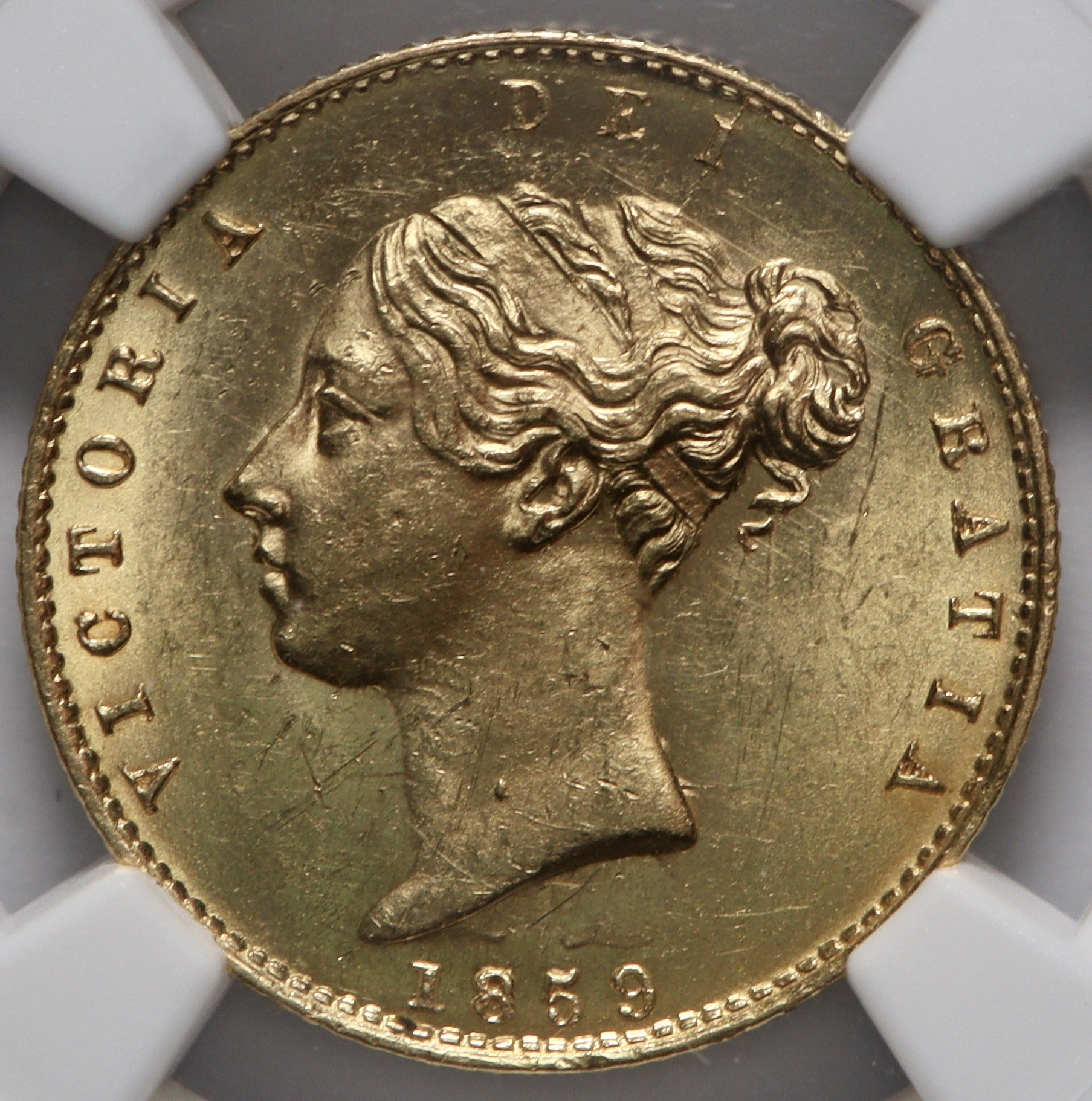 A simply stunning choice example of a 1859 Queen Victoria gold half sovereign. Only 4 better graded examples with NGC. Getting tougher to find truly superb examples.