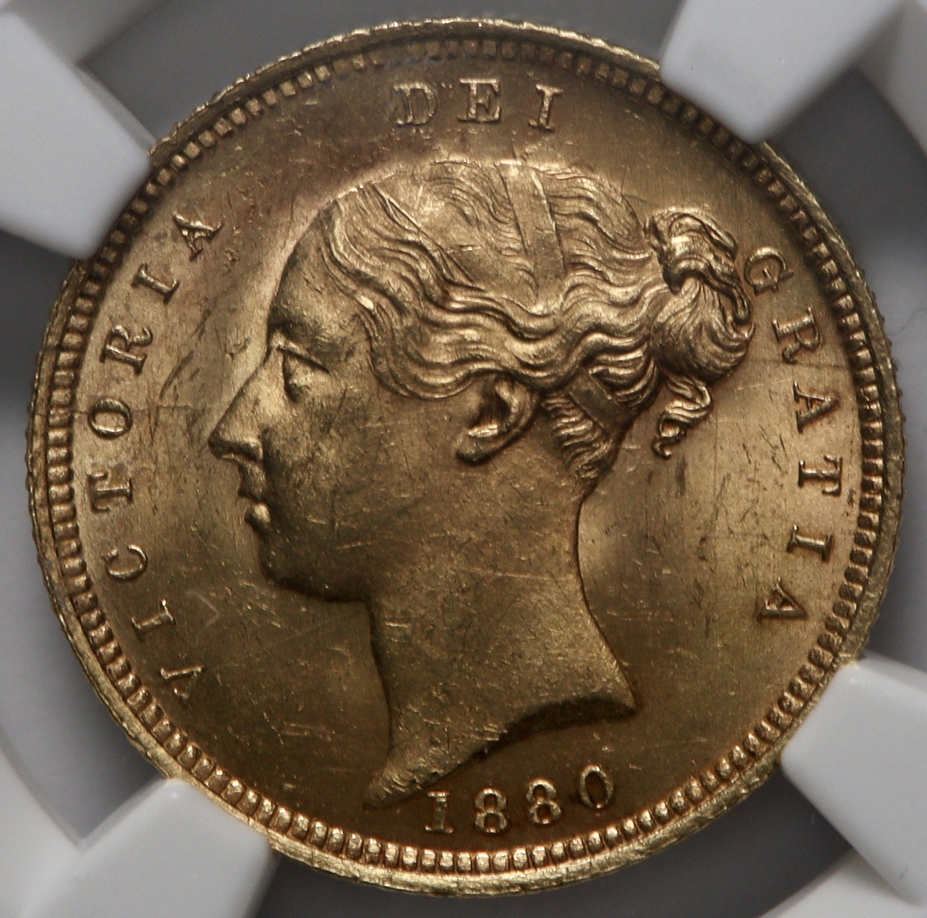 A simply stunning choice example of a 1880 Queen Victoria gold half sovereign. Only 2 better graded examples with NGC. Die no 115.