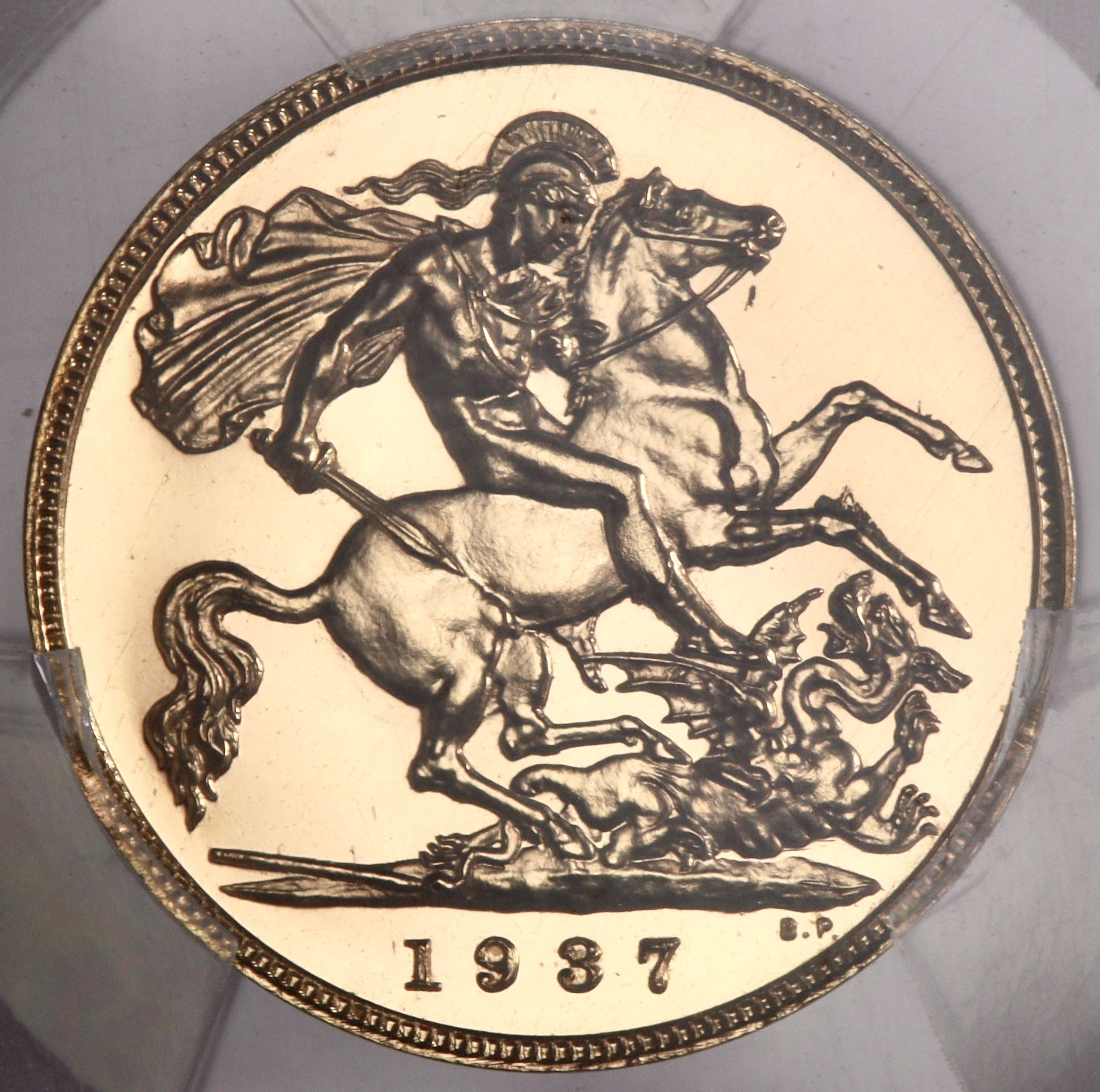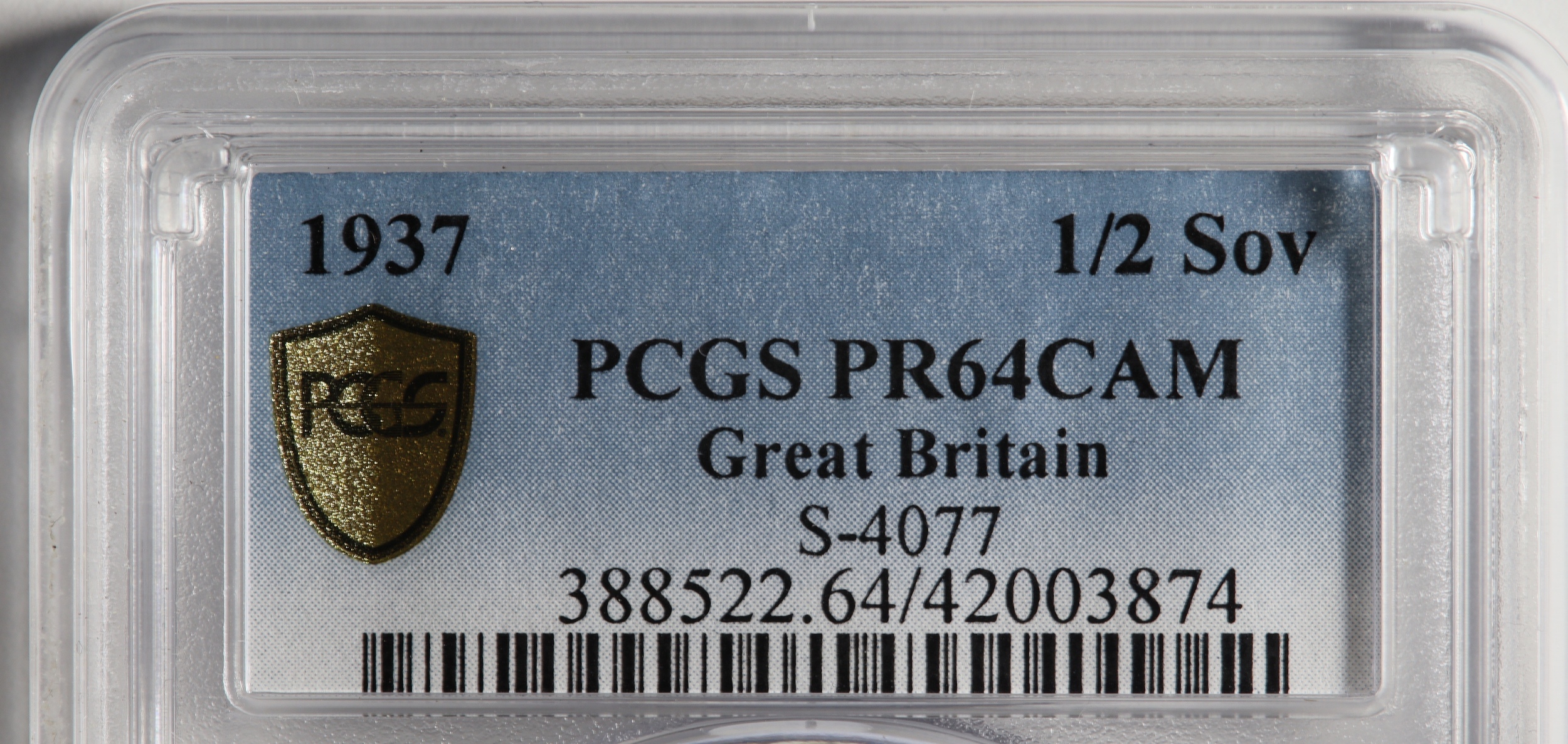 A 1937 King George V1 gold half sovereign. A flashy coin with mirror fields professionally graded as PF64 Cameo.