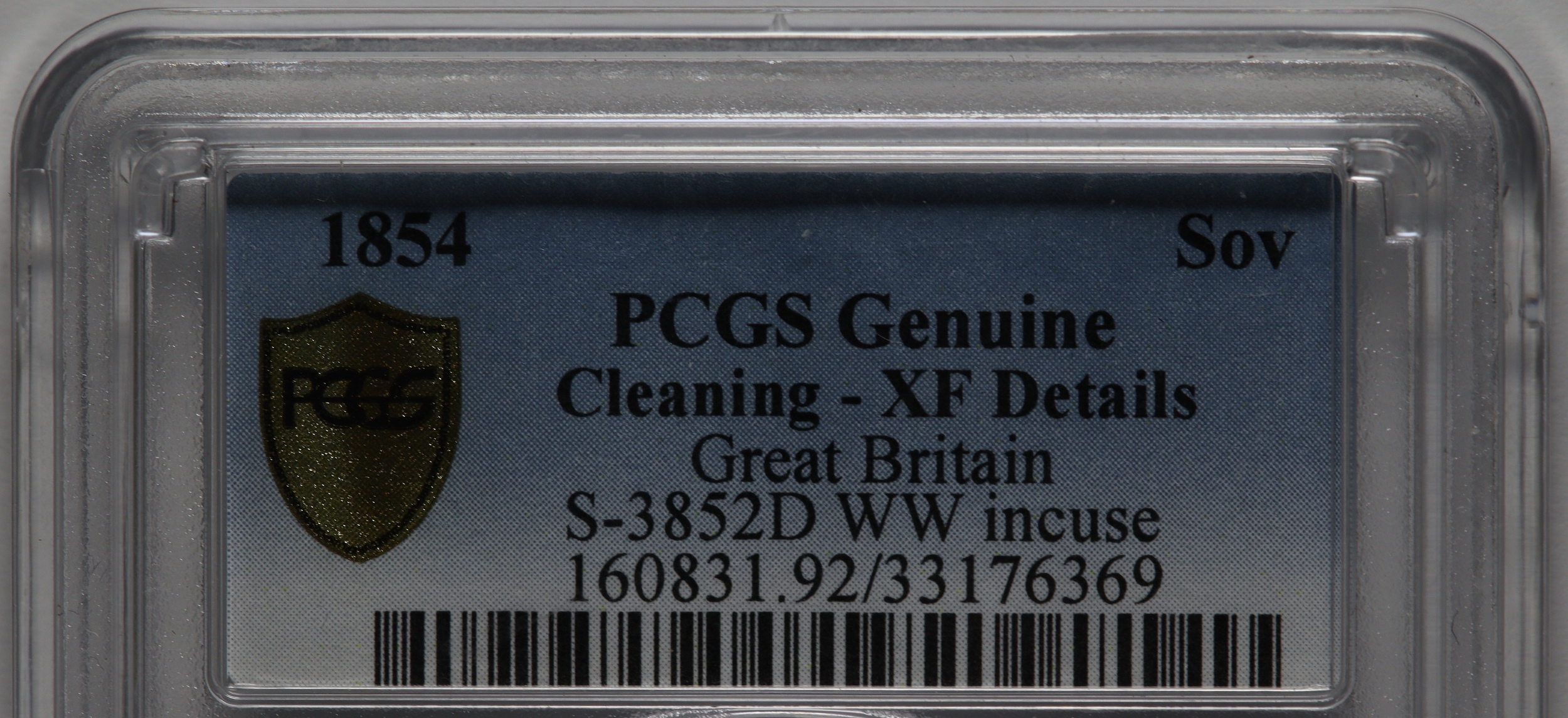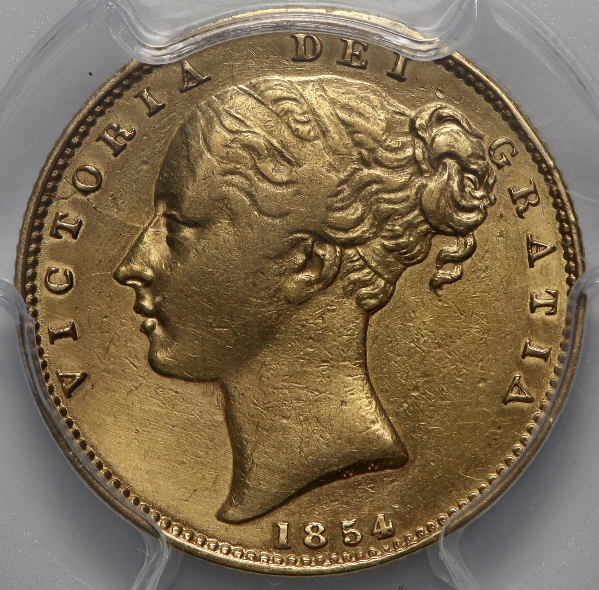 A PCGS graded genuine but cleaned Queen Victoria 1854 shield back full gold sovereign.