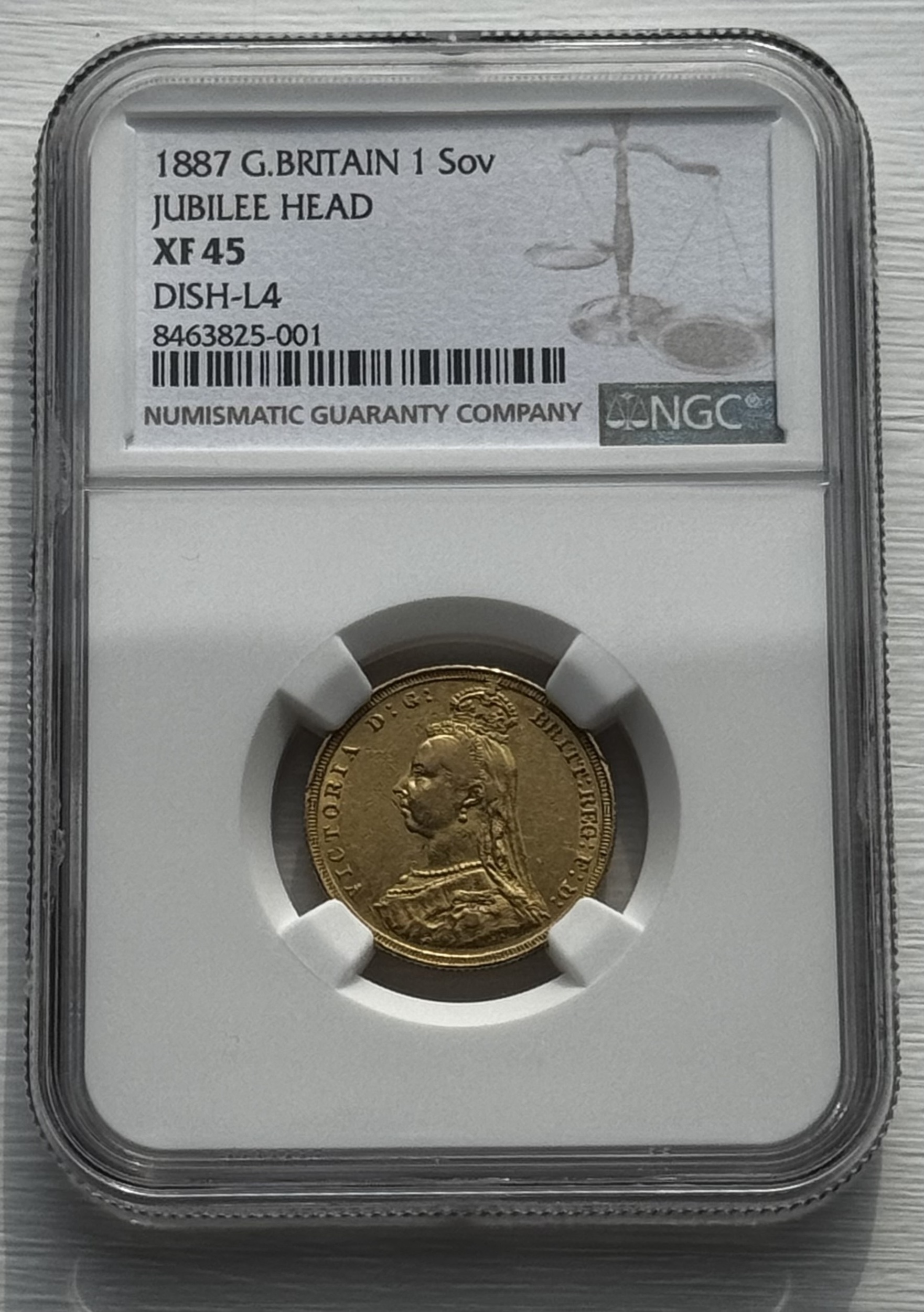 A NGC graded XF45 Queen Victoria 1887 Jubilee head full gold sovereign. DISH L4, Marsh rated R5, 9-14 known examples. Hooked J, closer initials in straight line. Population 1. Excessively rare.