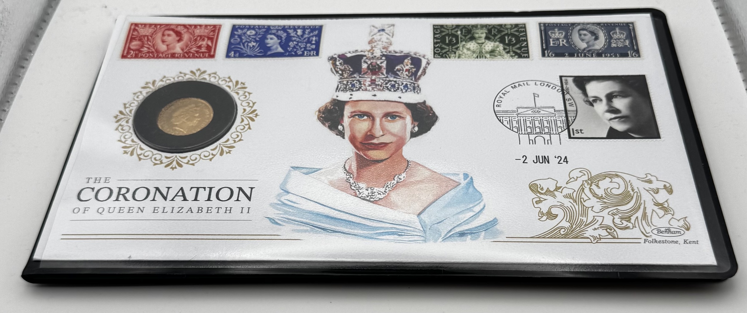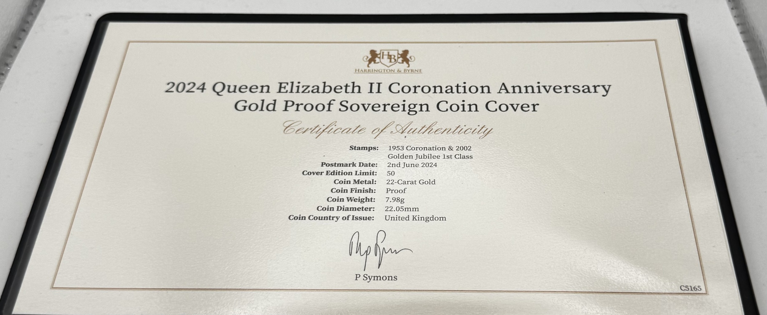Harrington & Byrne 2024 Queen Elizabeth 11 coronation anniversary Gold proof sovereign coin cover. Only 50 of these lovely covers were made. The 2002 proof gold sovereign is a one year design and is a wonderful collectors piece.