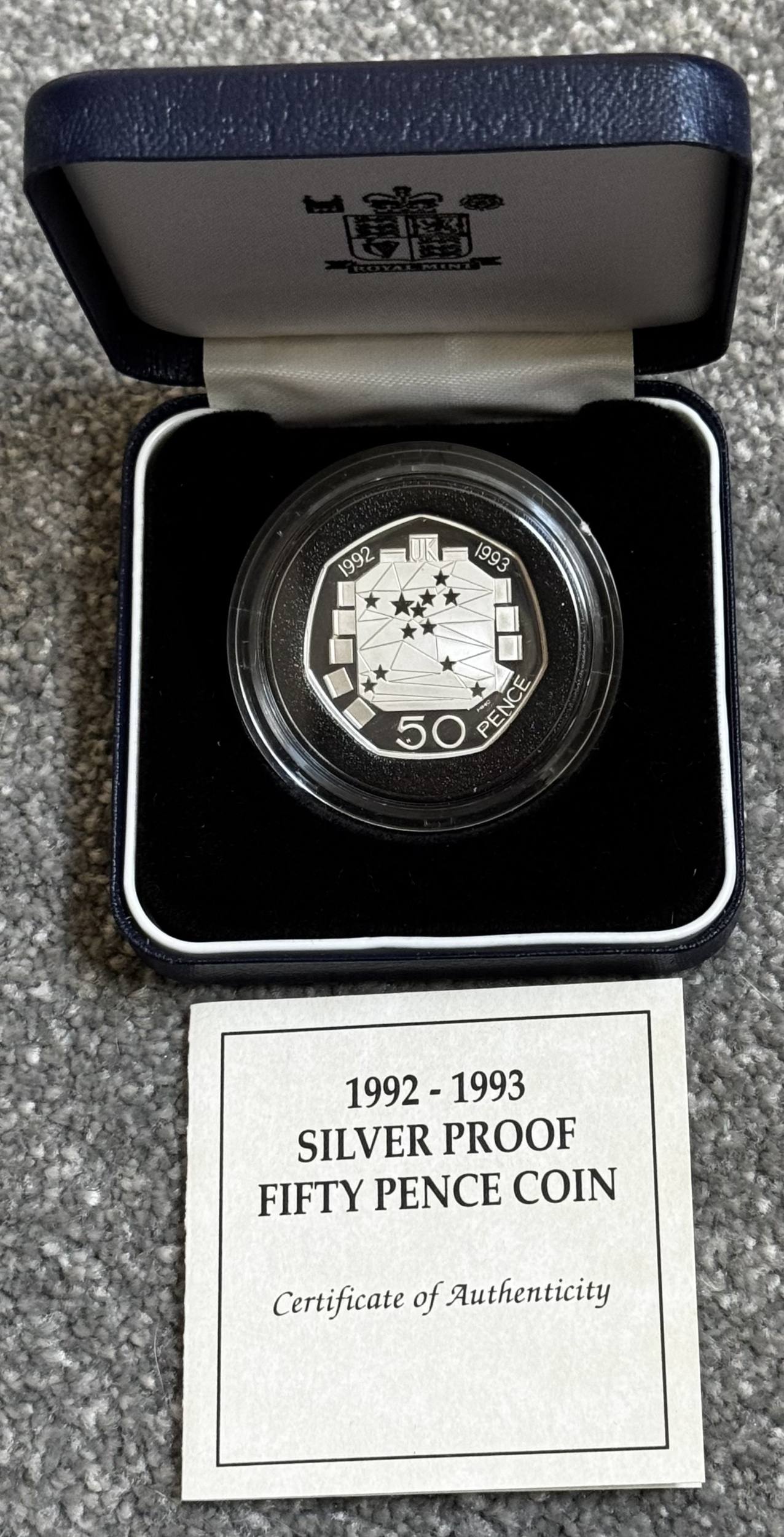 1992-1993 FDC Silver Proof Fifty Pence Coin - 13.5g Royal Mint Box and COA