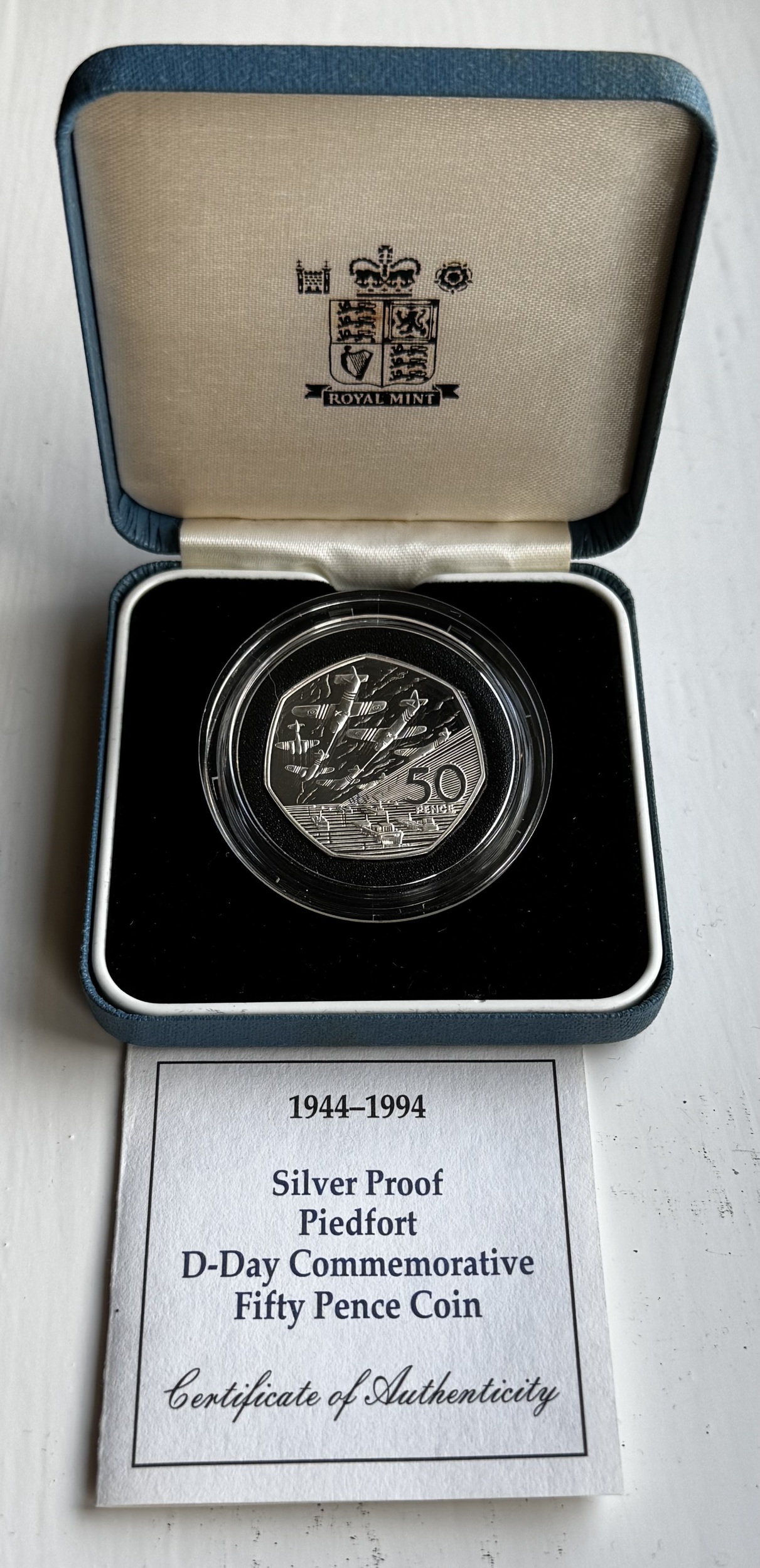 Beautiful 1944-1994 Silver Proof Piedfort D-Day Commemorative Fifty Pence coin Comes in a box with COA.