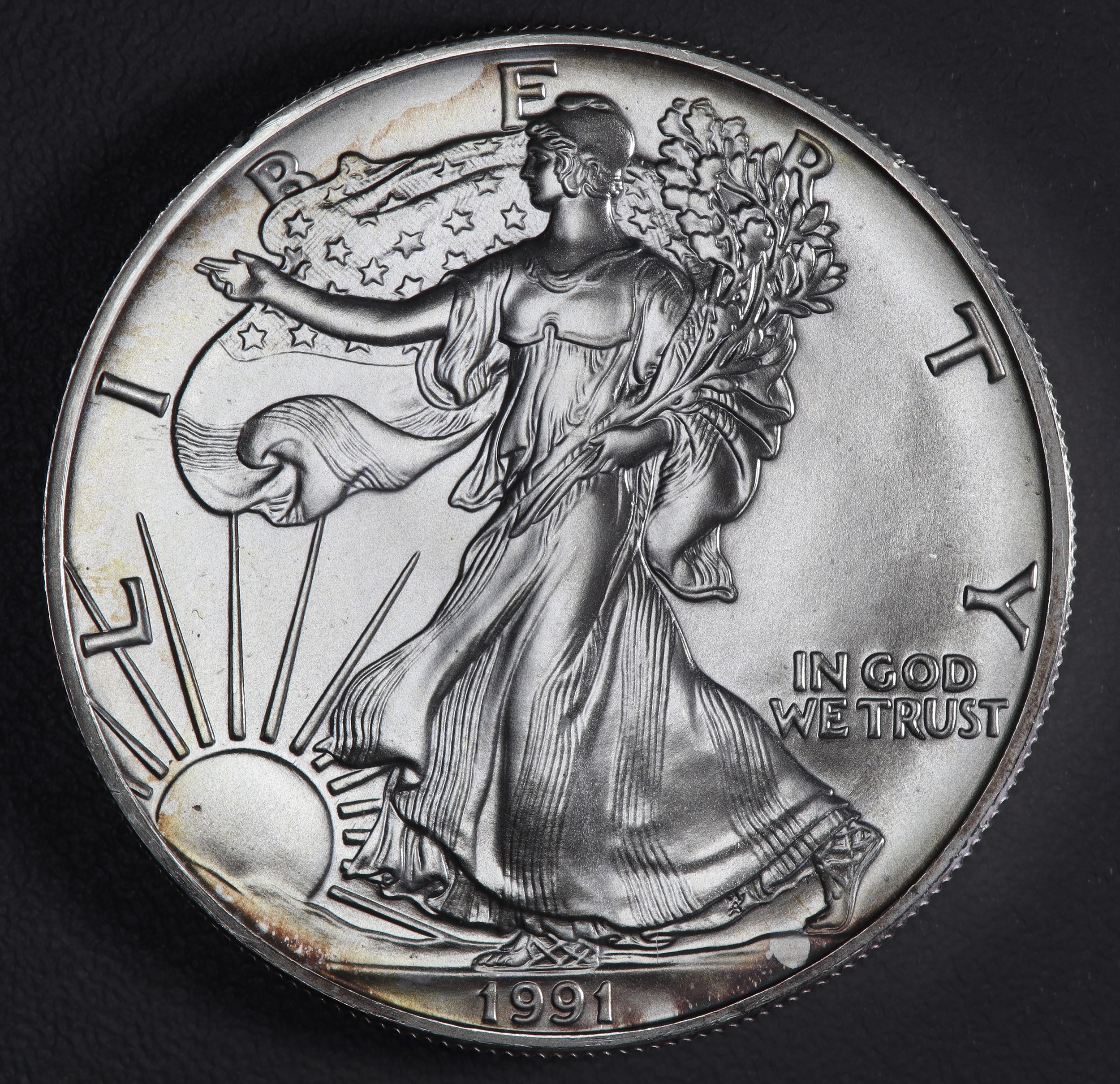 Nice early issue 1991 silver one ounce Eagle. One ounce of fine silver. Diameter - 40.6 mm Weight - 31.1 grams Quality - .999 silver