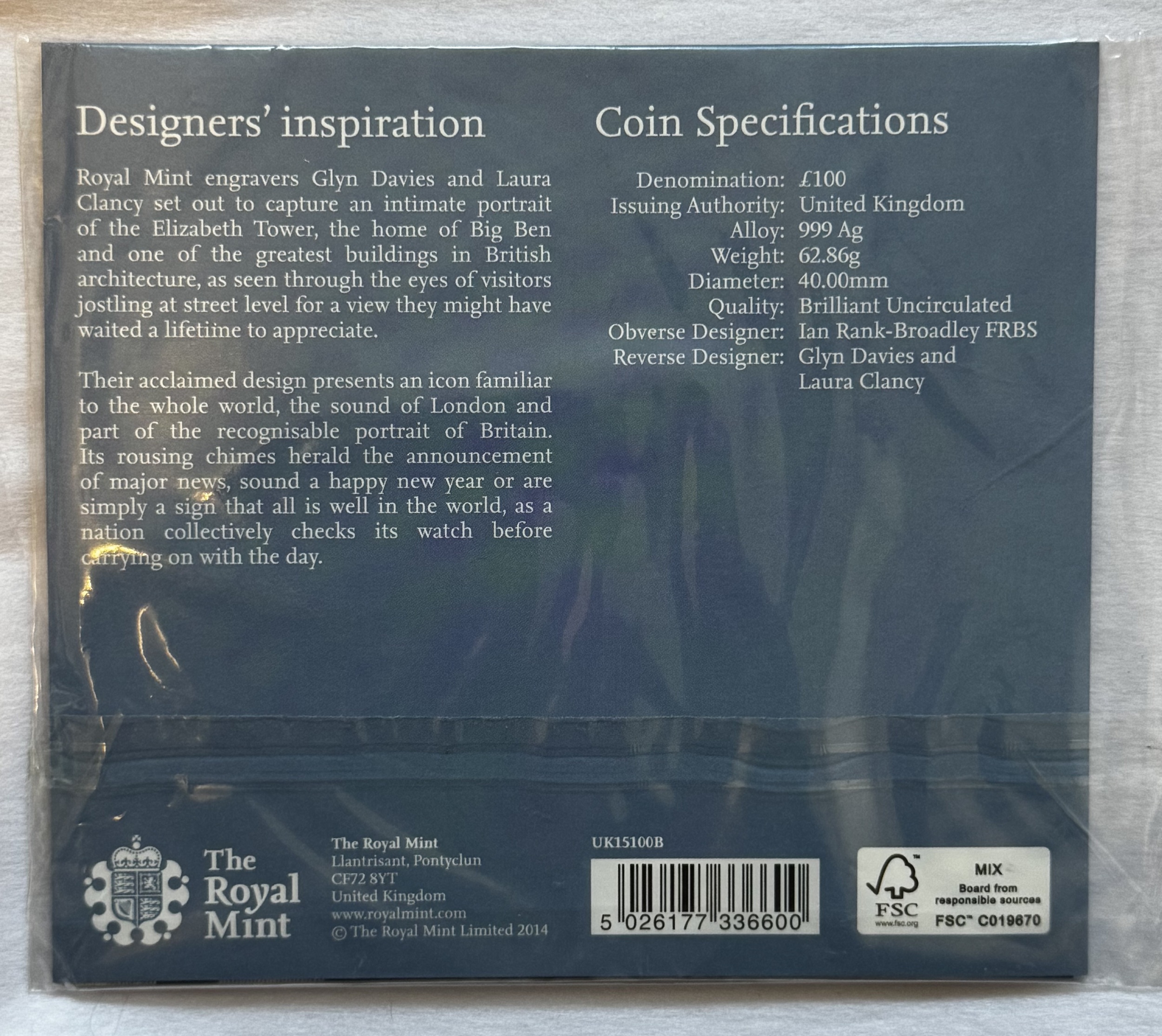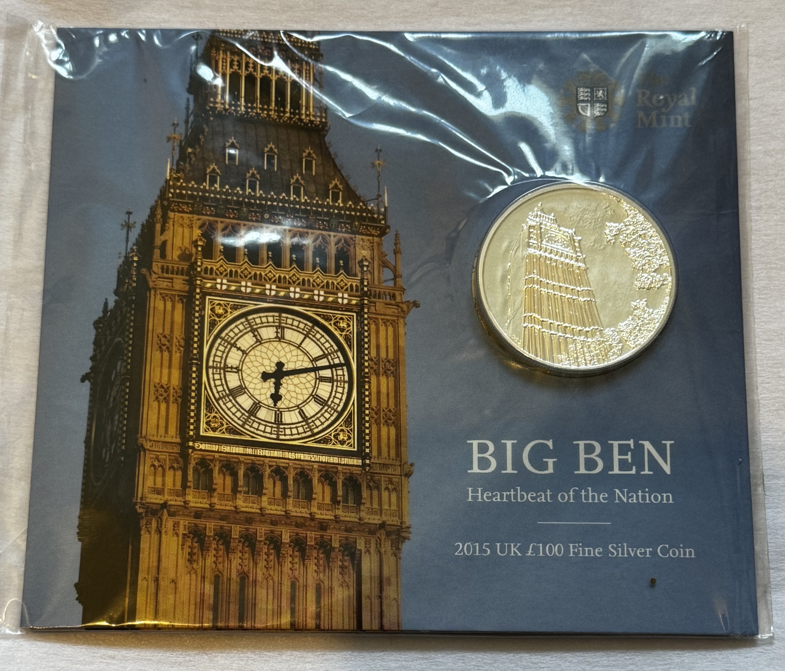 2015 Big Ben UK £100 Silver Coin - 62.86g Heartbeat of the Nation Sealed in original Royal Mint Packaging - not opened