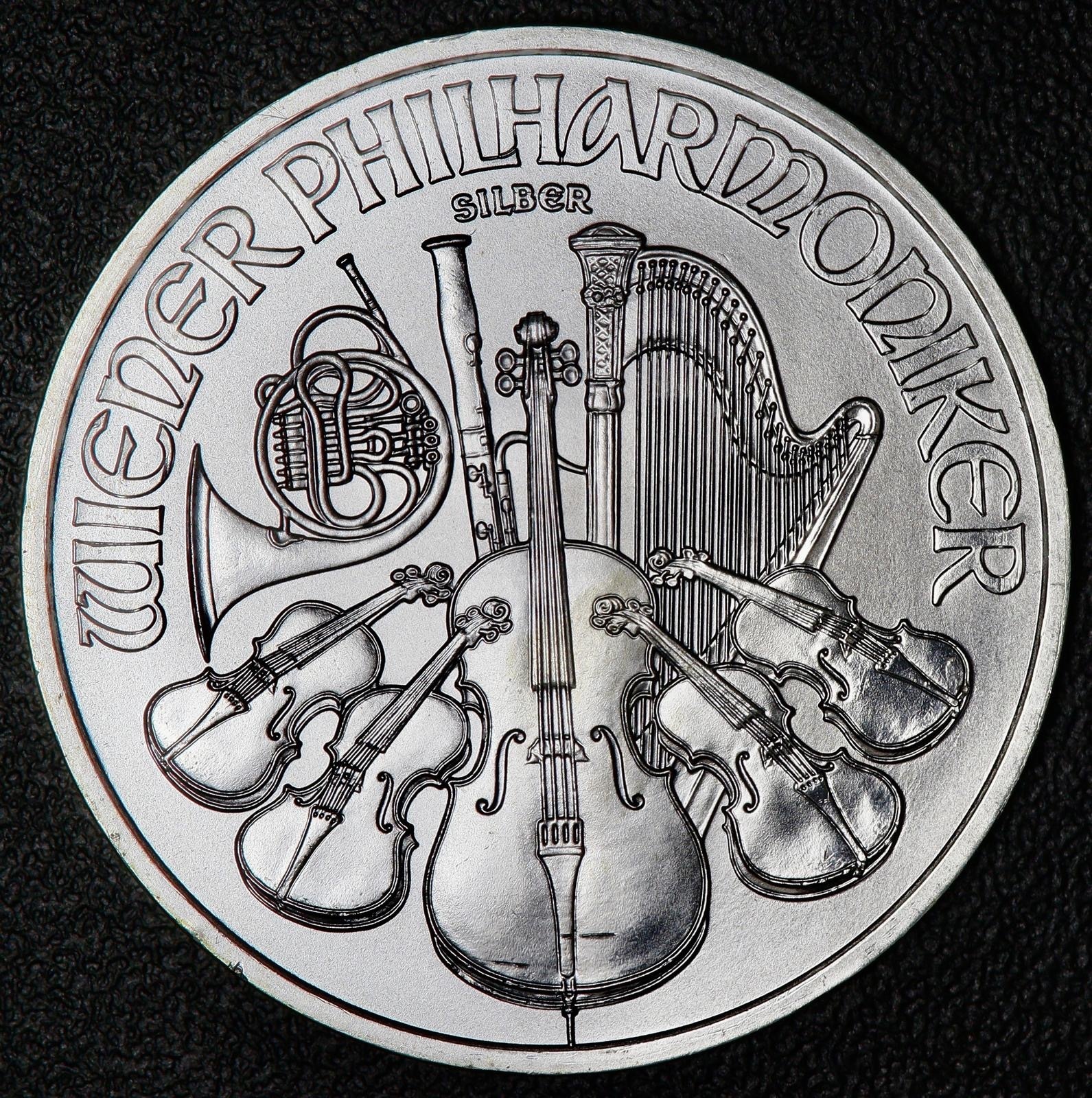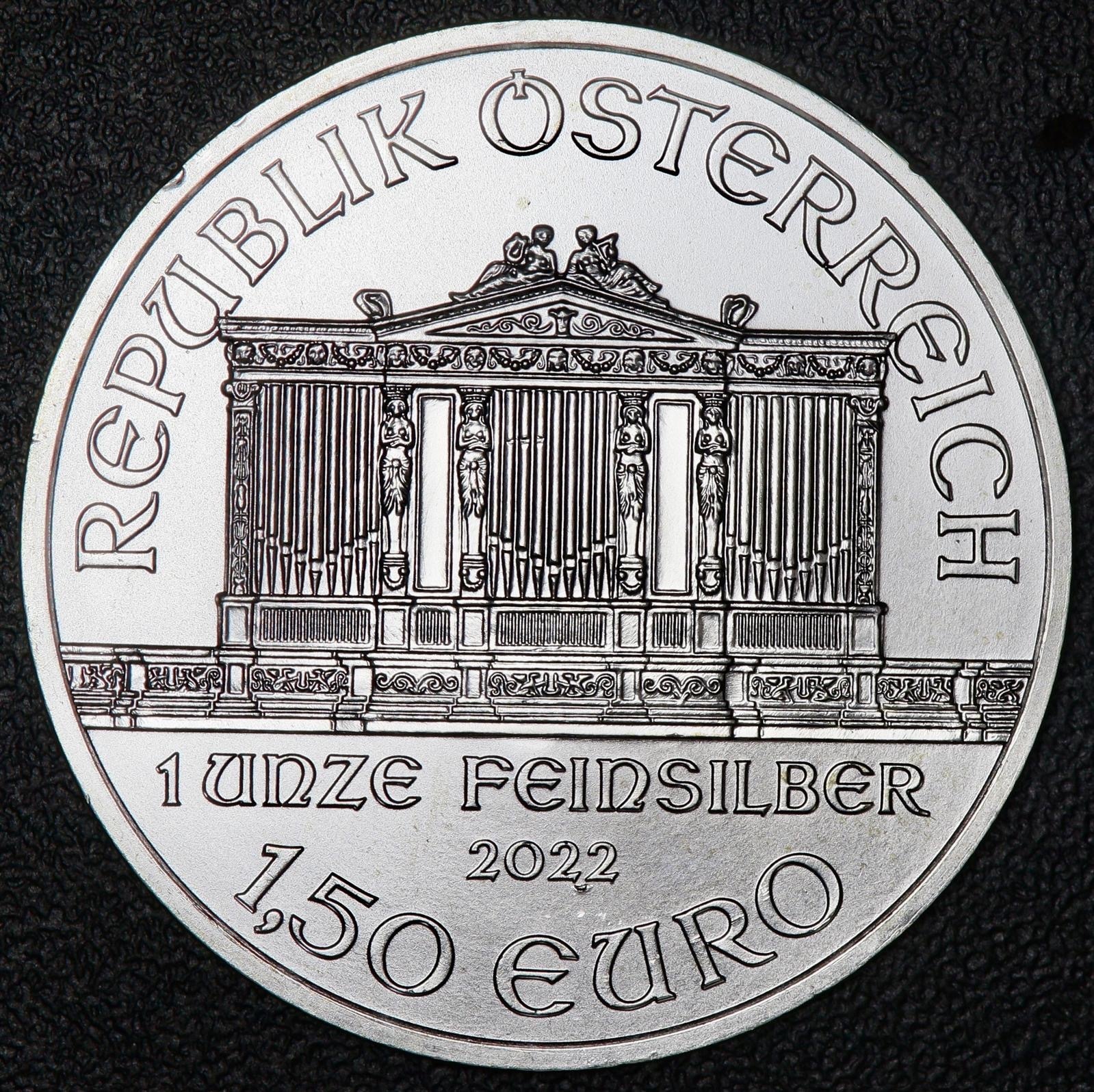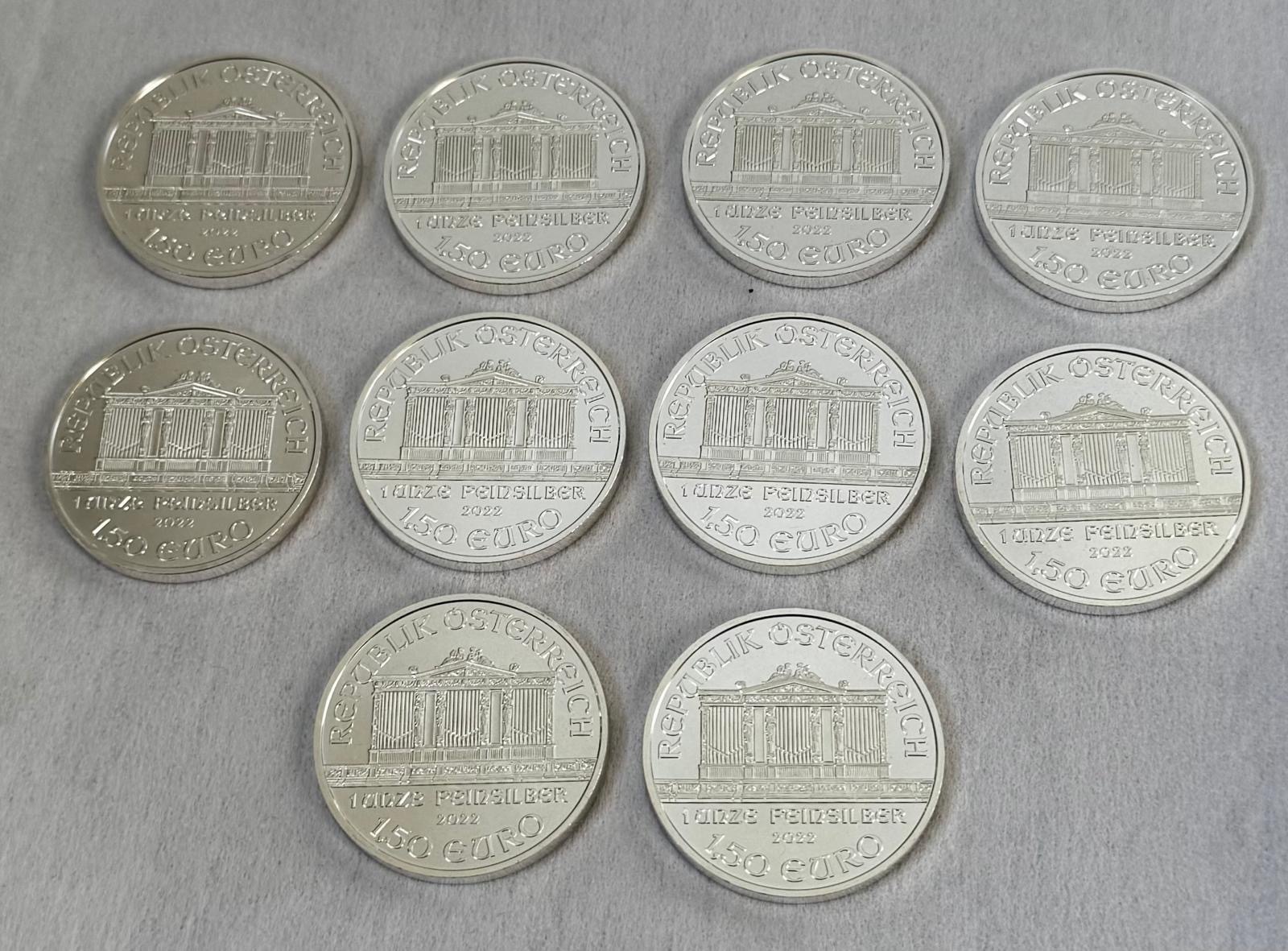 2022 10 x Austrian Philharmonic 1oz silver coin - 311g (31.1g per coin) Design features Obverse: The Great Pipe Organ in Vienna's Musikverein's Golden Hall. Obverse inscriptions: "REPUBLIK OSTERREICH" (Republic of Austria), "1 UNZE FEINSILBER" (1 ounce pure silver), and the face value of €1.50. Reverse: An arrangement of orchestral instruments, including a cello, four violins, a harp, a bassoon, and a Viennese horn. Reverse inscription: "Wiener Philharmoniker" (Vienna Philharmonic).