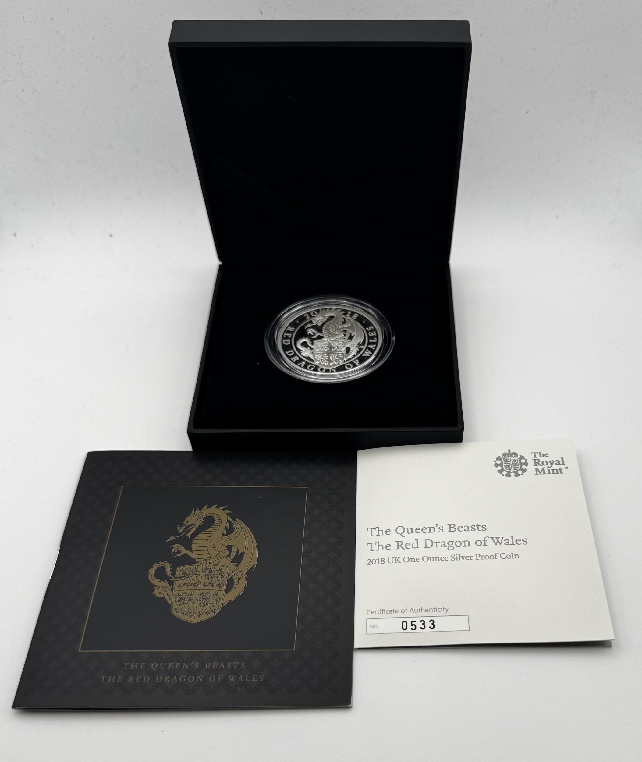 2018 QE11 silver proof ‘ The Red Dragon of Wales’ coin. Issue limit of 6000 this is number 0533. Complete with all original packaging and coa