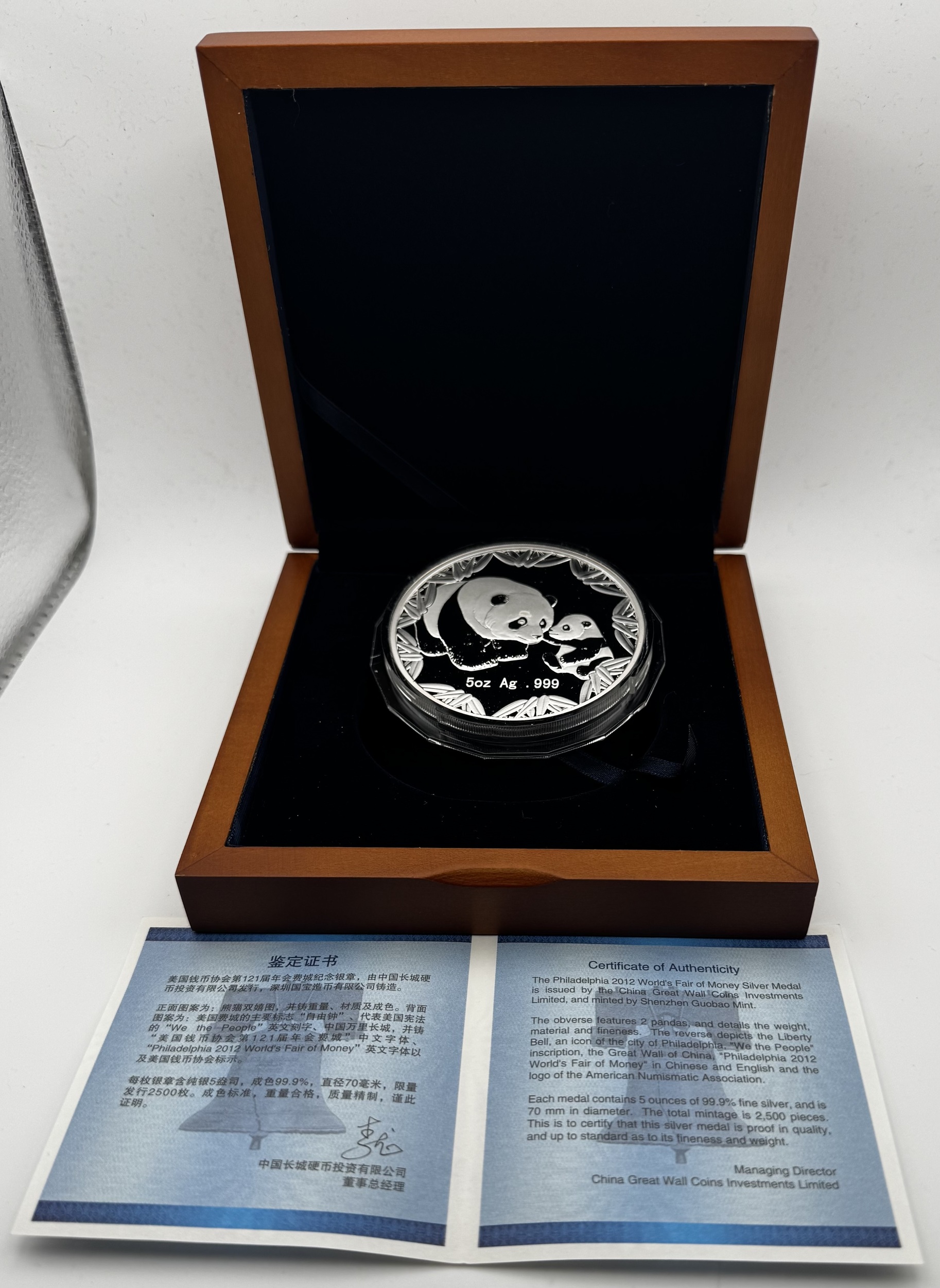 A rare 2012 Philadelphia worlds fair of money silver medal. A beautiful 5 ounce pure silver proof panda complete with original packaging and coa.